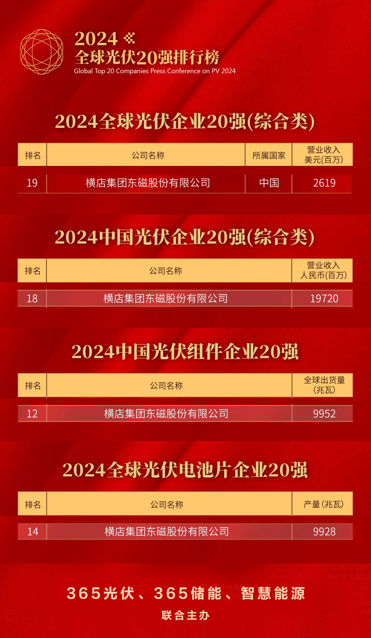 6月20日,“2024全球光伏20強、中國儲能20強排行榜”發布,橫店東磁位列四大榜單。