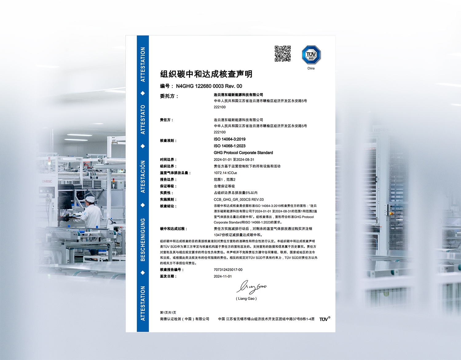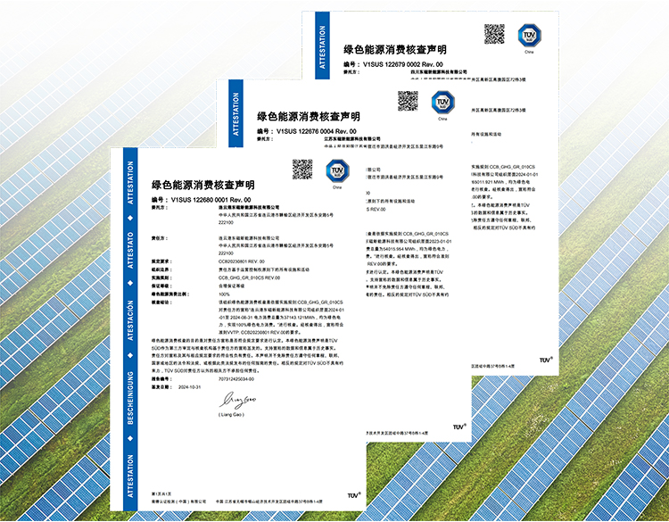 11月1日,橫店東磁太陽能連云港基地獲得TüV南德意志集團(以下簡稱“TüV 南德”)頒發(fā)的ISO14068組織碳中和達成核查聲明證書,為TüV南德在光伏行業(yè)頒發(fā)的首張該類證書。同日,橫店東磁泗洪、連云港和宜賓3個基地還獲得組織溫室氣體核查聲明和綠色能源消費核查聲明。